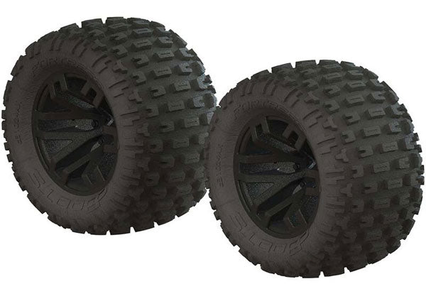 Coppia di pneumatici dBoots Fortress MT 2.2/3.0 incollati su cerchi neri con esagono da 14mm . Prodotto da Arrma