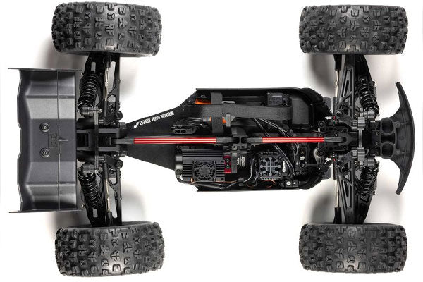 La piastra del telaio, i differenziali, il paraurti anteriore, la piastra paramotore e persino il supporto dell'ala sono stati tutti migliorati con la robustezza EXB (Extreme Bash). Nuove protezioni laterali, un rinforzo torre-torre in due pezzi e una torre interna della carrozzeria aggiungono più resistenza e semplificano la manutenzione. L'iconica carrozzeria del monster truck KRATON è ora disponibile in due nuove straordinarie finiture di fabbrica multicolore e ha un comodo sistema di ritenzione della carrozzeria a sgancio rapido e senza clip.