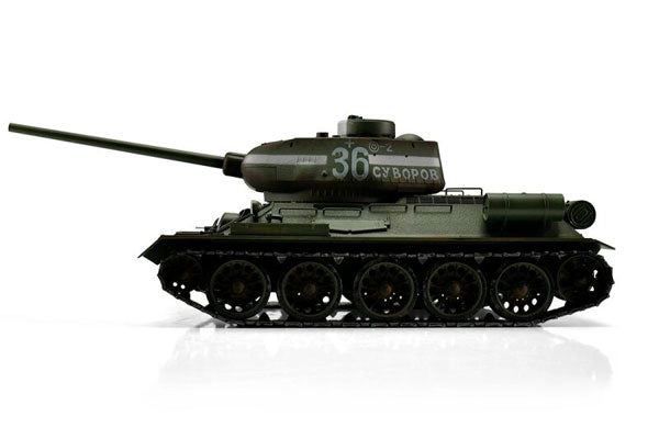 Con dimensioni di circa 500x190x175 mm (LxPxA), il carro armato RC T-34/85 è ideale per il modellista esigente. La Torro Pro Edition colpisce per la finitura aerografata a mano di qualità eccezionale e per la tecnologia a 2,4 GHz con altoparlante integrato. Grazie al peso elevato, questo modello offre caratteristiche di guida superiori, soprattutto fuoristrada. I cingoli di alta qualità, le ruote motrici e di rinvio, così come le ruote stradali, lo scafo inferiore e la torretta, sono realizzati in metallo. Accessori come gli adesivi coordinati completano perfettamente la replica in scala reale.