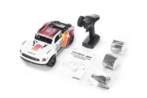 L'MJX HYPER GO è un truck da short course in scala 1:14 senza compromessi, con motore brushless, elettronica di precisione (giroscopio incluso) e un robusto telaio con carrozzeria in policarbonato (PC). Il telaio interamente in metallo, lo sterzo CNC, i differenziali in metallo e gli ammortizzatori regolabili da 69 mm a bagno d'olio garantiscono una maneggevolezza ottimale su ghiaia, argilla o asfalto. L'ESC brushless da 45 A (2S/3S), abbinato al motore 2852, garantisce un'accelerazione potente e una velocità massima fino a 70 km/h (con 3S).