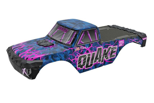 Carrozzeria tagliata e verniciata completa di decals per modello Quake di colore viola. Prodotto dalla Arrma.